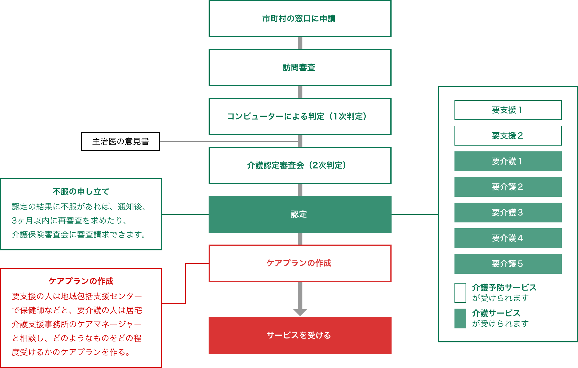 介護保険を利用してさまざまな介護サービスを利用するために、被保険者やその家族は、介護保険被保険証を添えて、保険者である市(区)町村に要介護認定の申請をします。申請後、1次判定、2次判定を経て、「非該当(自立)」「要支援1、2」「要介護1~5」のいずれかに判定されます。